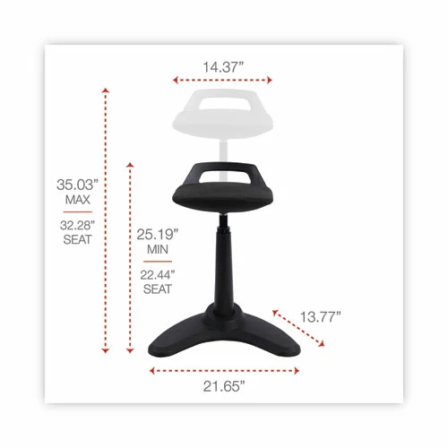 Advanced active ergonomics goes from sitting to standing with ease. Pivoting angled column moves with the body for constant alignment. Perch or lean when you wish to perform fast tasks or fully sit down when you wish to concentrate on more complicated tasks. Goes from sitting height to standing height. Perfect for use with height adjustable workstations. Auto return swivel seat moves with the body as you twist, and returns to front automatically when you get up. Dual integrated height adjustment levers for quick adjustments with either hand. Wide boomerang base for stability when leaning far forward.