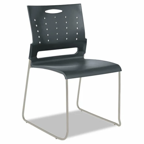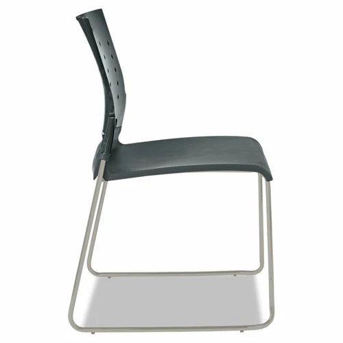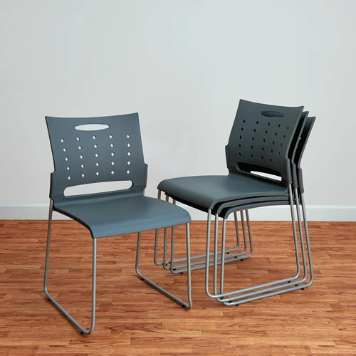 A smart stack chair for the office, conference room, auditorium or breakroom. Molded plastic seat and durable metal frame withstands heavy use, resists scratching and denting, and is a snap to clean. Modernistic perforated back design for breathability and comfort. Flexi back adjusts based on user weight and provides lumbar support. Waterfall seat edge reduces pressure points at the back of the leg. Convenient handle grip for ease in stacking and transporting. Stacks neatly up to 12 high.
