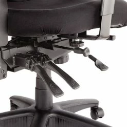 Multifunction mechanism with seat glide allows back angle adjustment relative to seat, adjustable tilt (free floating or infinite locking positions) and forward tilt. Cool, breathable mesh back. Contoured seat cushion with waterfall edge to help relieve pressure on legs. Height- and width-adjustable arms with soft polyurethane pads. Five-star base with casters for easy mobility.
