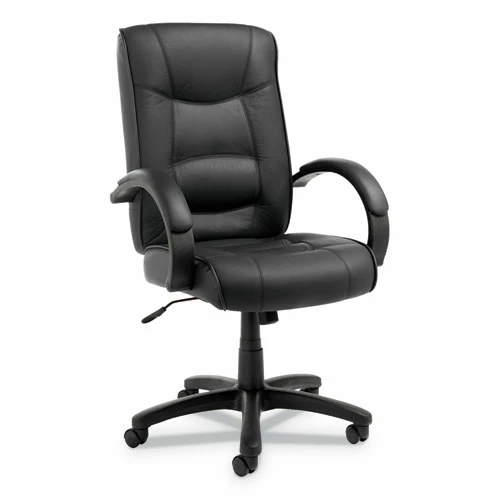 Sink into this luxurious high-back chair for all-day office comfort. Tailored seat and back with top-grain leather upholstery. Waterfall seat design reduces pressure at the back of your knees for improved circulation. Roll armrests feature padded leather caps for added comfort. Heavy-duty nylon base has dual-wheel casters for easy mobility.