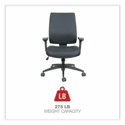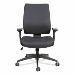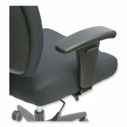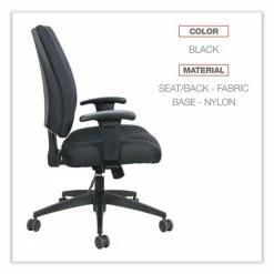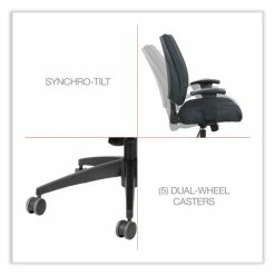 Designed to last in the busy office with smart ergonomic features for optimal comfort. Synchro-tilt mechanism allows back to recline in a 2-to-1 ratio to the seat to help keep your feet on the ground even when leaning back. Waterfall seat edge reduces pressure at the back of knees. Impact-resistant molded plastic shell. Padded slant T-arms are height- and width-adjustable. Durable fabric upholstery is tested for longevity and resists fading. Five-star base with casters for easy mobility.