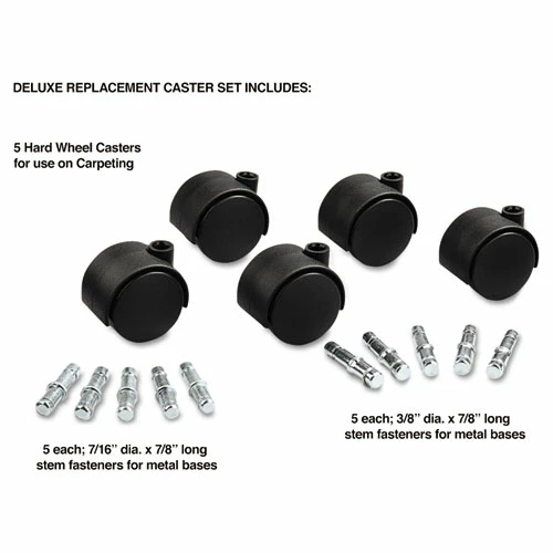 Includes 5 wheels and 10 stem fasteners; 5 each 7/16″ x 7/8″ and 5 each 3/8″ x 7/8″ fits most metal bases.
