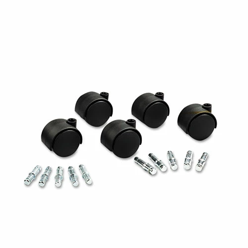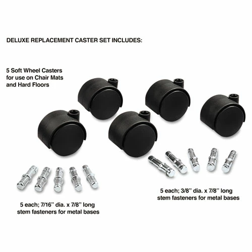 Includes 5 wheels and 10 stem fasteners; 5 each 7/16″ x 7/8″ and 5 each 3/8″ x 7/8″ fits most metal bases.
