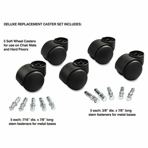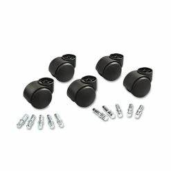 Includes 5 wheels and 10 stem fasteners; 5 each 7/16″ x 7/8″ and 5 each 3/8″ x 7/8″ fits most metal bases.