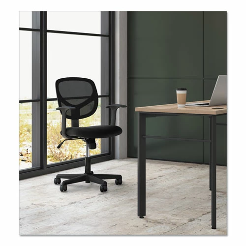 The task chair features a breathable mesh back and durable sandwich mesh on the seat.